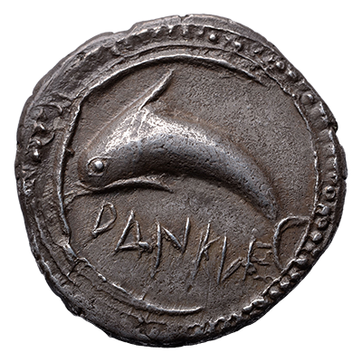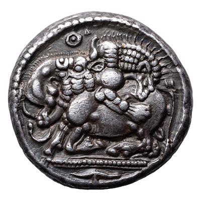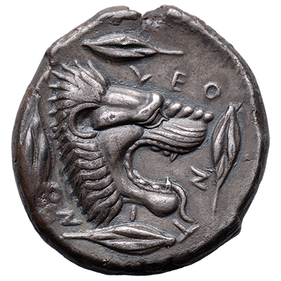 Sometimes engravers used visual puns to remind viewers of the coin's origin. In this case the lion is a pun on Leontini. The barley grains refer to the city's fertile land.