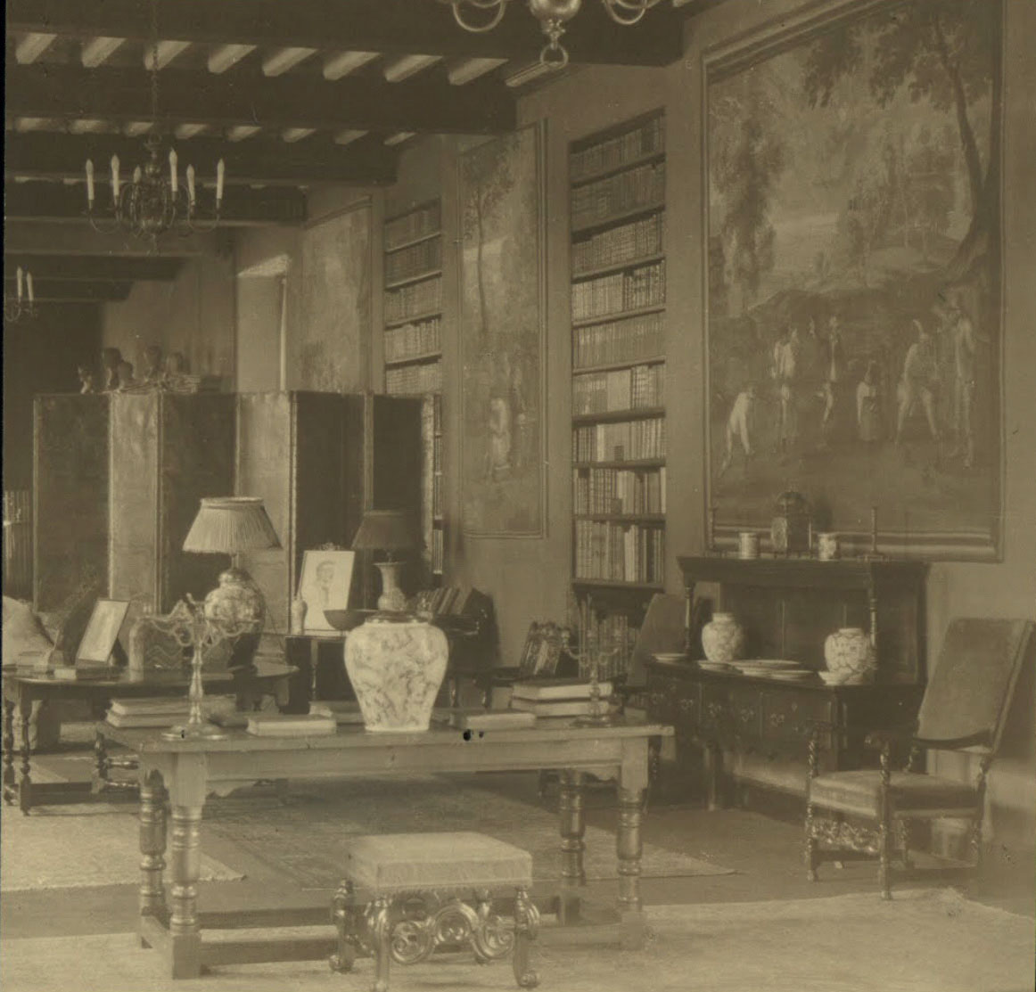 An early photograph of the library at sutton place with five busts visible to the upper left.