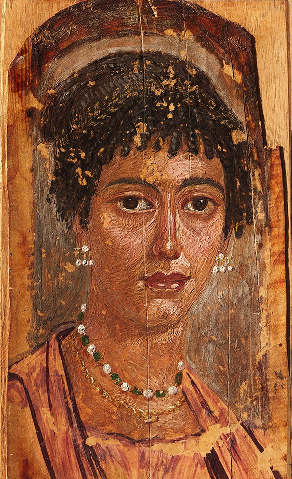 This striking painting of a young, elegant lady vividly captures the essence of a woman from two thousand years ago. Likely a member of the Graeco-Egyptian community, the portrait reflects the sitter’s wealth and status, depicting a woman from a prosperous multicultural city wearing luxury goods made from the finest imported materials. Her jewellery, made to order by highly skilled craftsmen, is embellished with large polished emeralds from the Mons Smaragdus (Emerald Mountains) near the Red Sea coast, and pearls from the warm waters of the Persian Gulf. Her elaborate hairstyle, achievable only through the efforts of personal maids or household servants, is adorned with an ebony hairpin, a prestigious wood imported from the Somali Peninsula via trade routes on the East African coast.