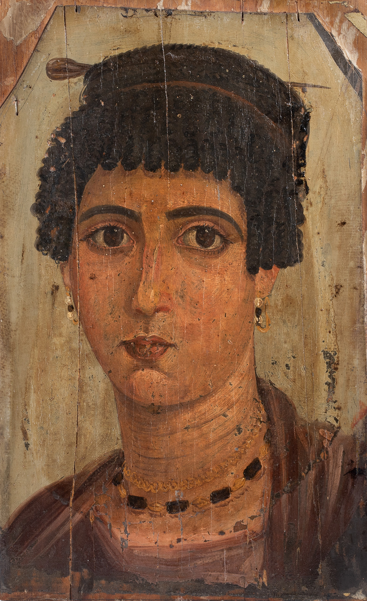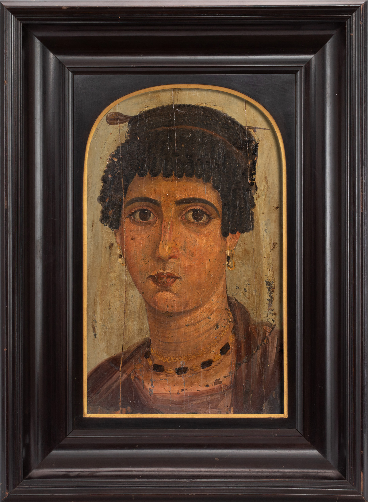 The style of the present portrait closely adheres to earlier Greek painting traditions, capturing the subject in three-quarter view. Since no panel paintings from the Greek world have survived, the portraits of the Fayum Oasis – conserved by Egypt’s arid climate – are the only examples of an art form that ancient literary sources place among the highest achievements of Greek culture.