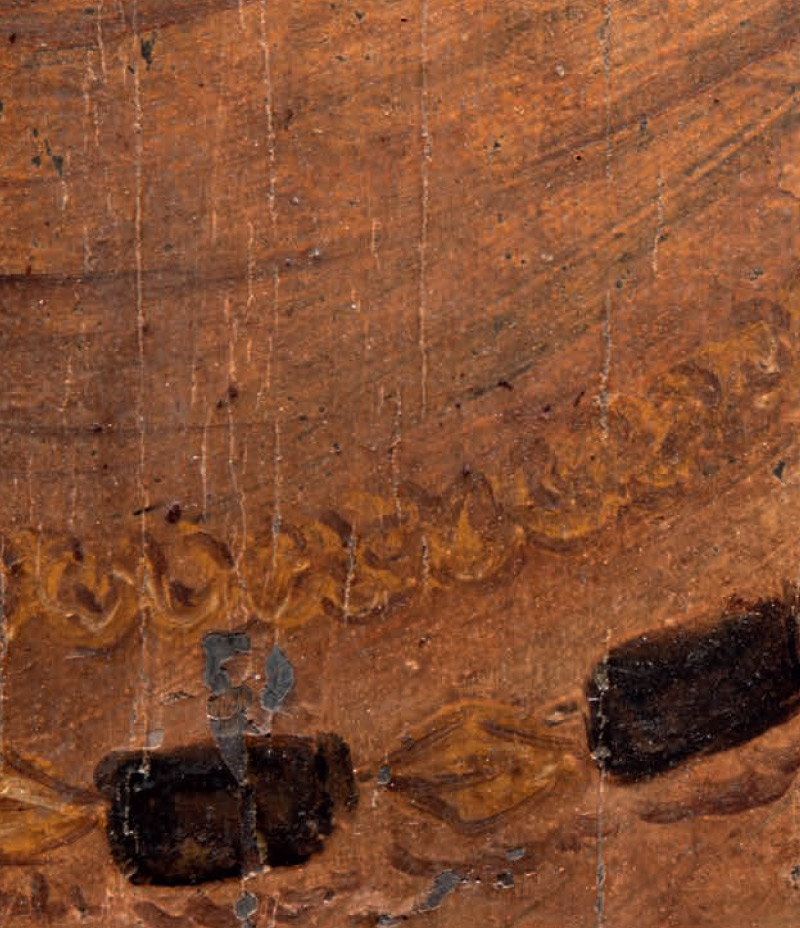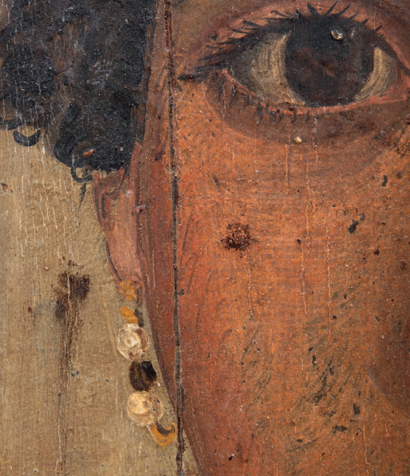 Painted in the encaustic technique, in which pigment is suspended in beeswax, and using a metal tool known as the cauterium, many of these panel portraits display the typical impasto effect. However, what sets Portrait L apart is the refined and notably ‘painterly’ style, created by thinning or emulsifying the wax, and by the widespread use of another tool: the penicillum, or bush. Indeed, this more painterly style can be seen in areas of both cheeks, where the wax is so thin that hints of the ground layer beneath can be seen. This innovative approach also allowed the artist to create subtle transitions of shadow that would have been hard to achieve with thick impasto. It also enabled the artist to sharpen the definition and realism of the subject’s large eyes, which are presented with a level of detail and intensity that is unparalleled.