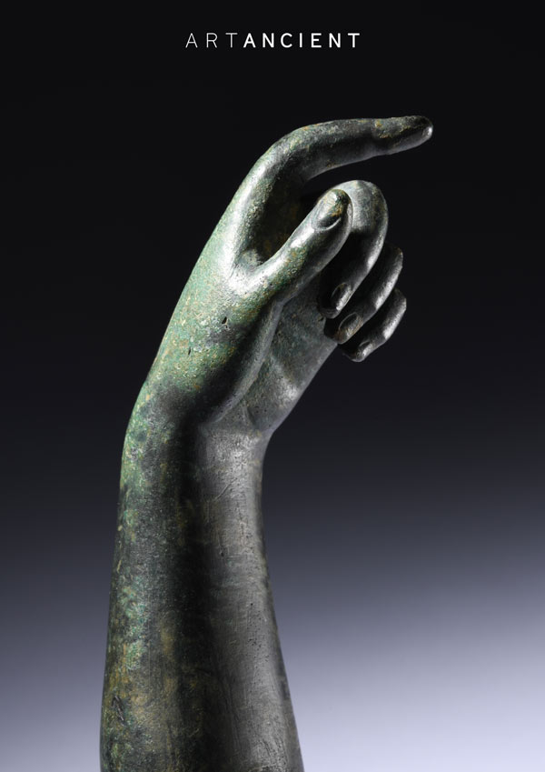 A finely modelled left arm of a bronze statuette, bent at the elbow with hand poised to hold a thyrsus, identifying the depicted as the Olympian god of wine and revelry - Dionysus.