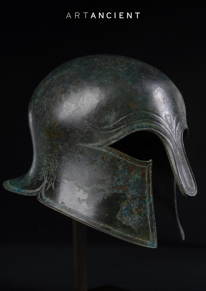 An exceptionally well preserved example of one of the most iconic ancient Greek artefacts. This is the finest and best preserved example of an elaborate helmet type represented on the celebrated Archaic masterpiece, The Armento Rider.
