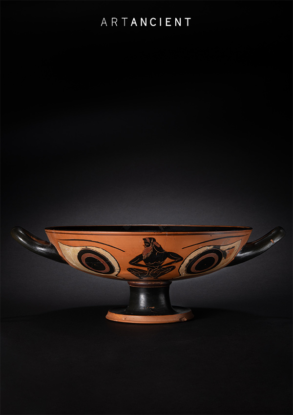 A rare, erotic cup exemplifying the revelry and humour of ancient Greek culture, particularly within the context of symposia - the social drinking parties of the elite. This wine cup features two large eyes on the exterior, which, when tilted up to drink, humorously superimpose themselves onto the drinker’s face. At the same time, the act of drinking reveals the cup’s indecent imagery, perhaps adding an element of playful surprise.