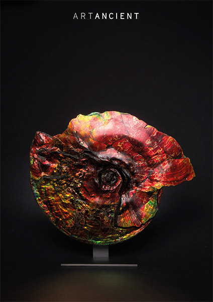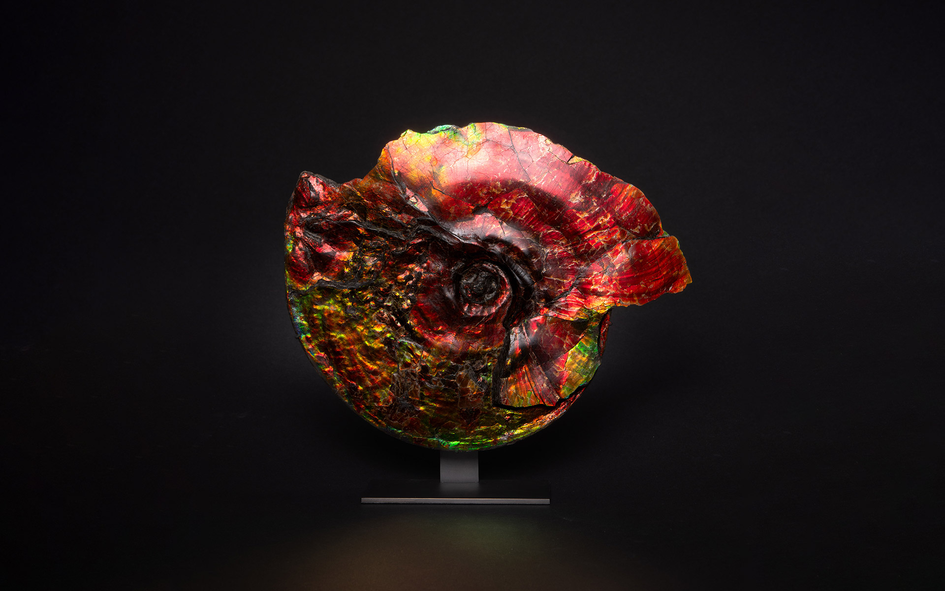 A magnificent example of one of the most spectacular fossil types known. Many of the extraordinary ammonites recovered from the Bearpaw Formation suffer from compression and losses, requiring reconstruction from multiple individuals. This specimen is notable for its original condition and intense, unenhanced rainbow iridescence.